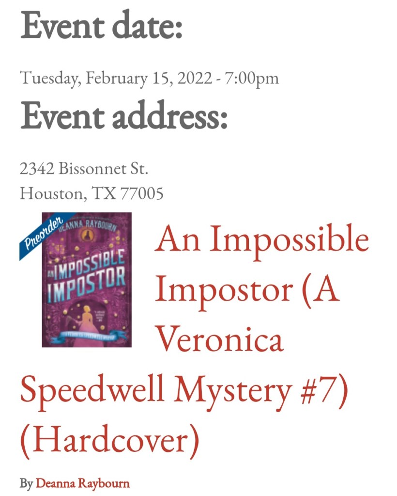 Hosted on Facebook Live by Murder By The Book bookstore in Texas, Deanna Raybourn was interviewed about her newest book An Impossible Impostor from the Veronica Speedwell Mystery series coming in at book number seven.